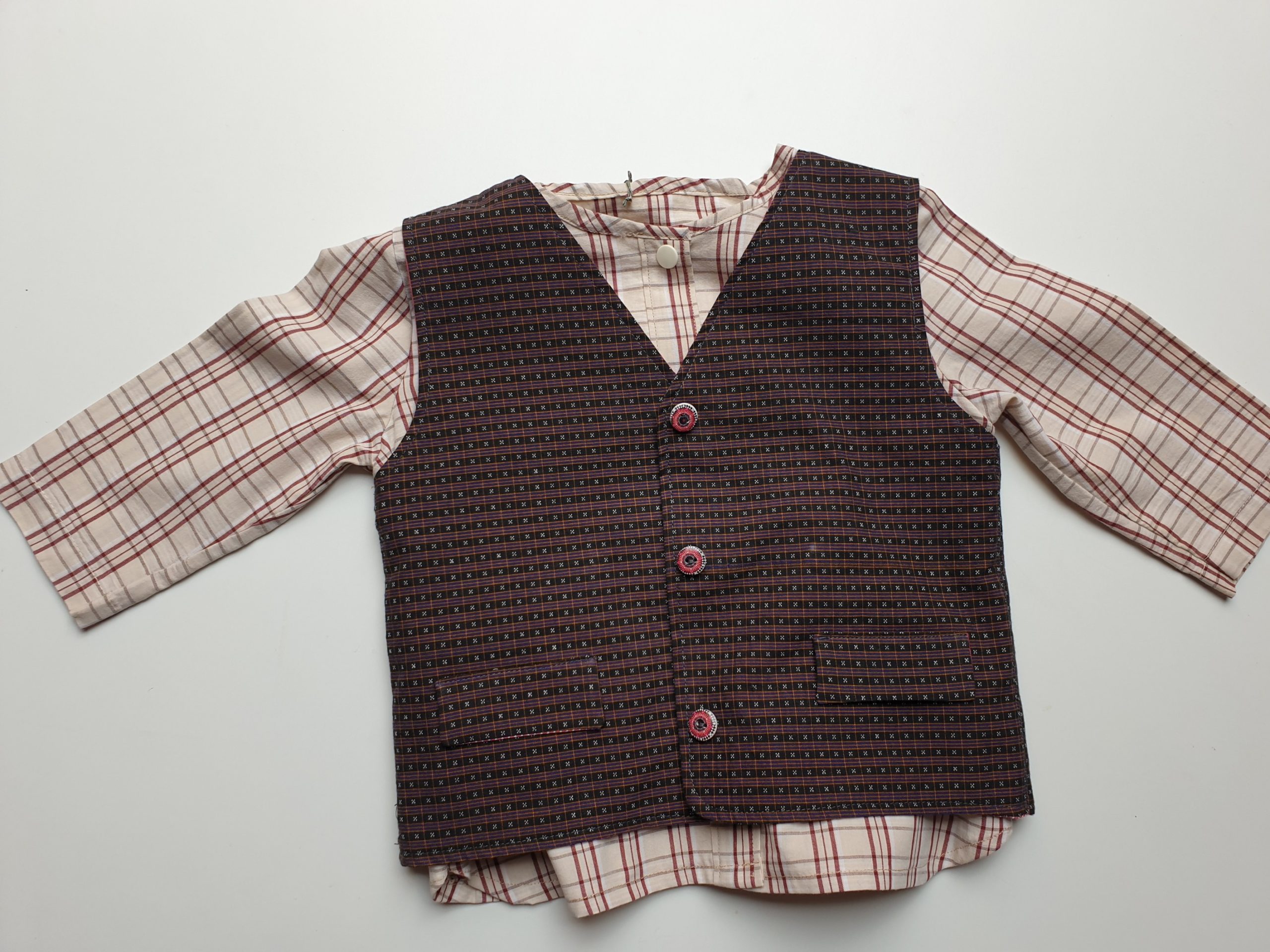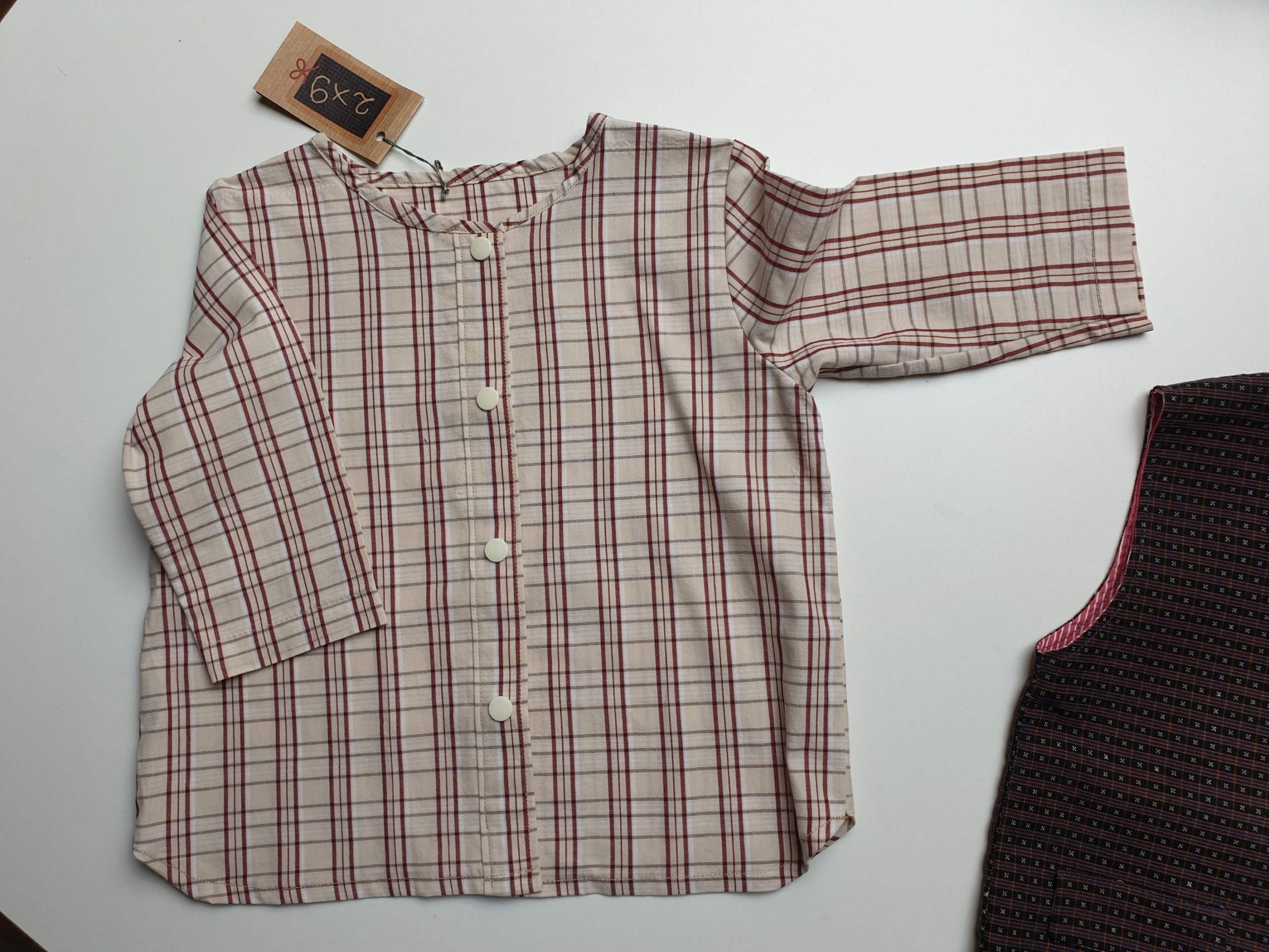 Chemise en coton beige à carreaux rouges, manches longues, encolure ras du cou, boutons pression devant.