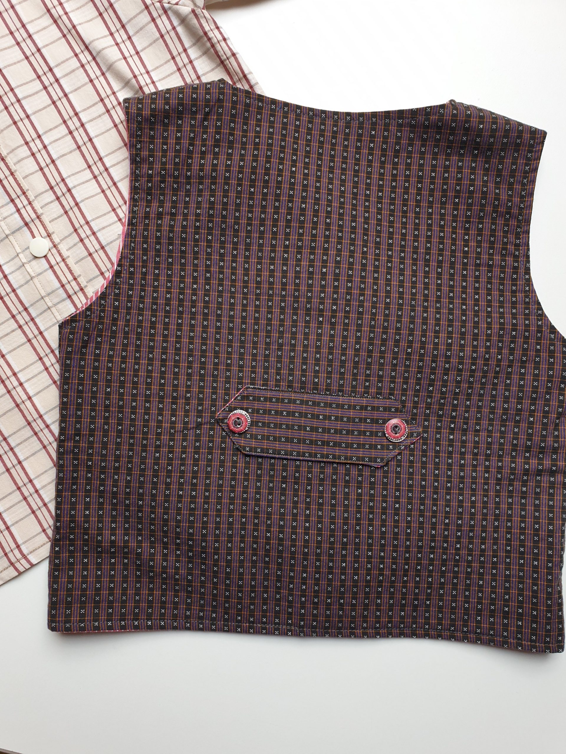 Gilet sans manche en coton à petites impressions, coloris noir et rouge, doublure rouge en coton, encolure en V, rabats de poches et martingale.