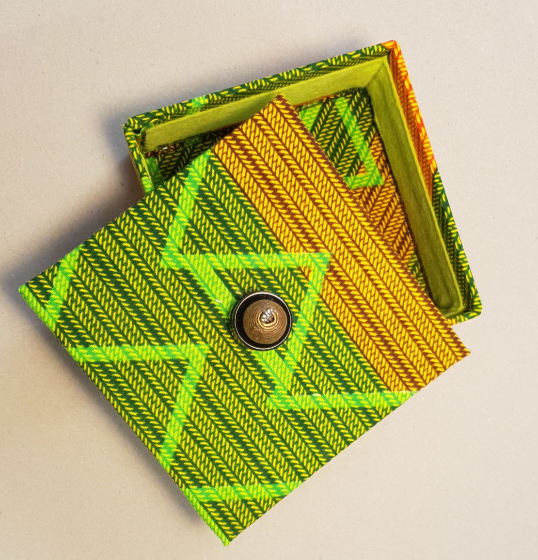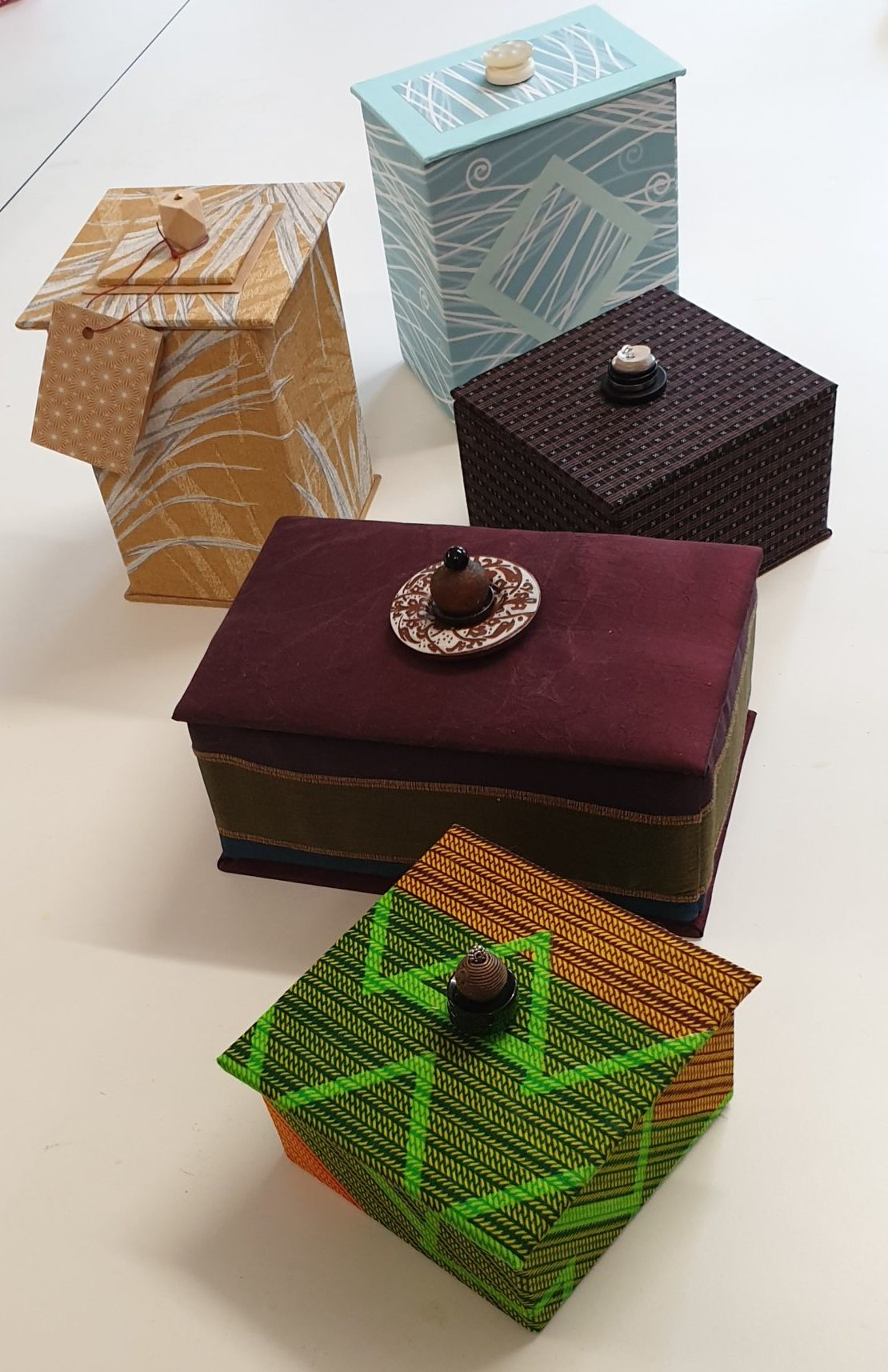 Boîtes avec couvercle. Carton rigide recouvert de tissu. Coloris vert, jaune, orange.