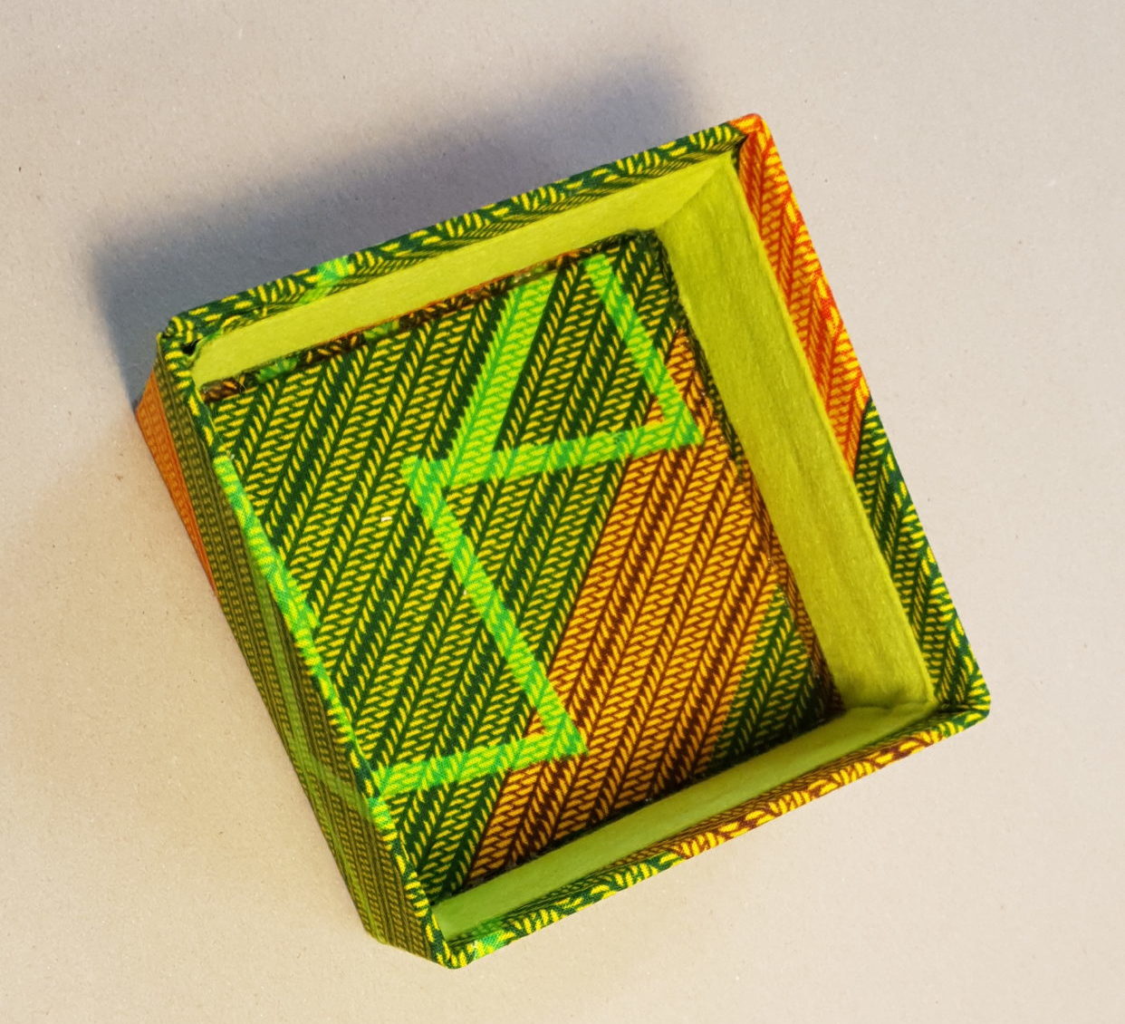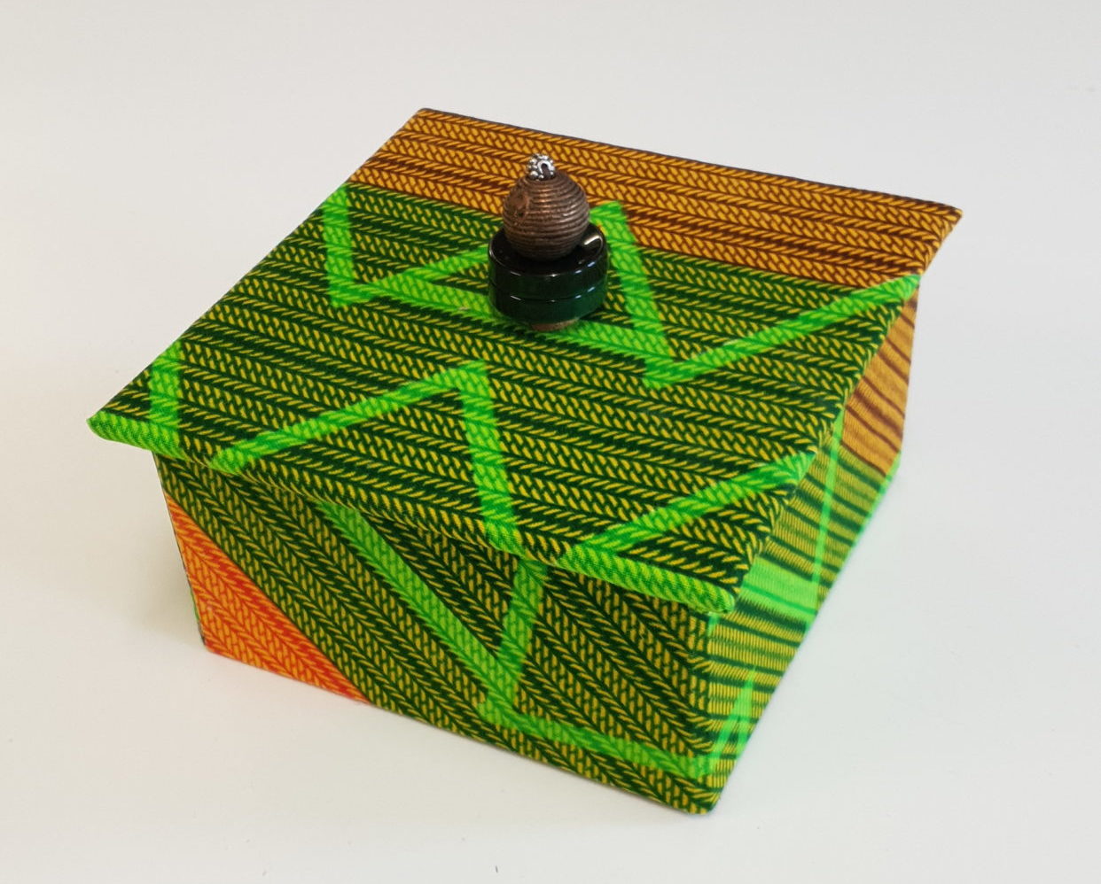Boîtes avec couvercle. Carton rigide recouvert de tissu. Coloris vert, jaune, orange. Dimensions: 12/12/7 cm