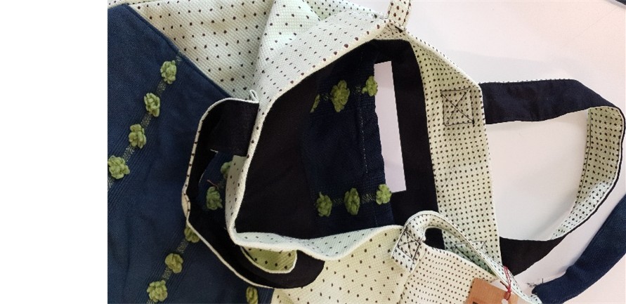 Sac cabas avec anses et bandoulière. En coton dans les tons de vert. poche extérieure triangulaire et petite poche intérieure.