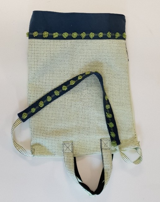 Sac cabas avec anses et bandoulière. En coton dans les tons de vert. poche extérieure triangulaire et petite poche intérieure. Dimensions: 35/45 cm