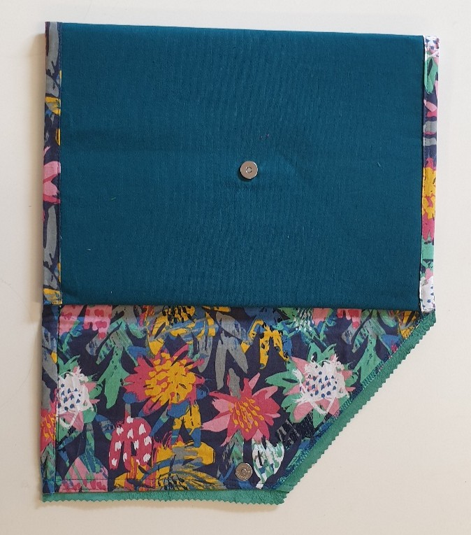 Housse en tissus colorés et bordures de daim pouvant contenir un cahier A4. Avec rabat et fermeture à pression.