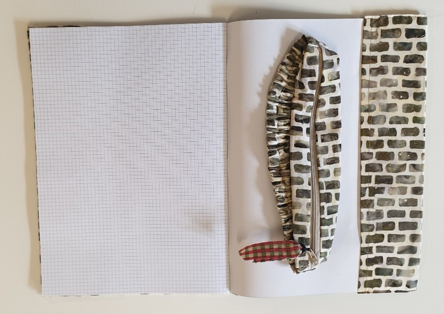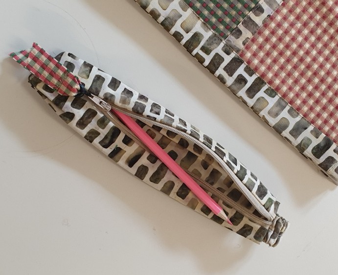 Housse en tissu, patchwork de style vintage, avec petite trousse à crayons en guise de fermeture. Pour cahier A4.