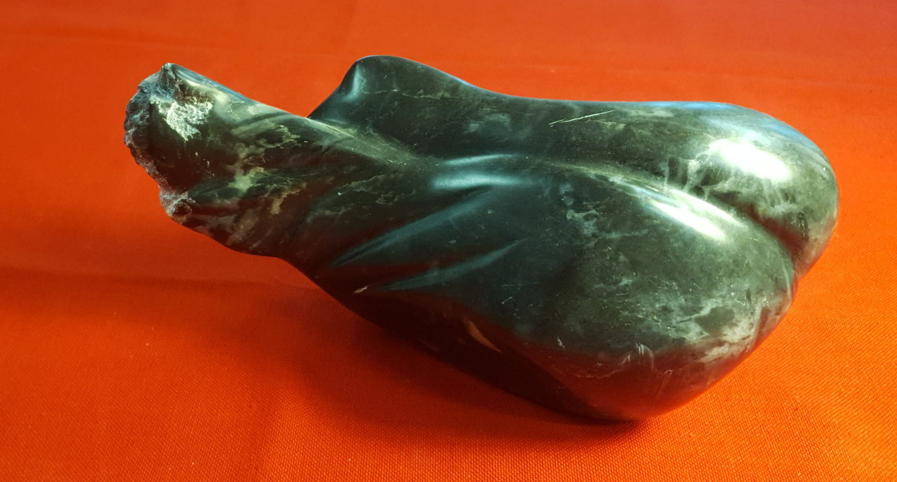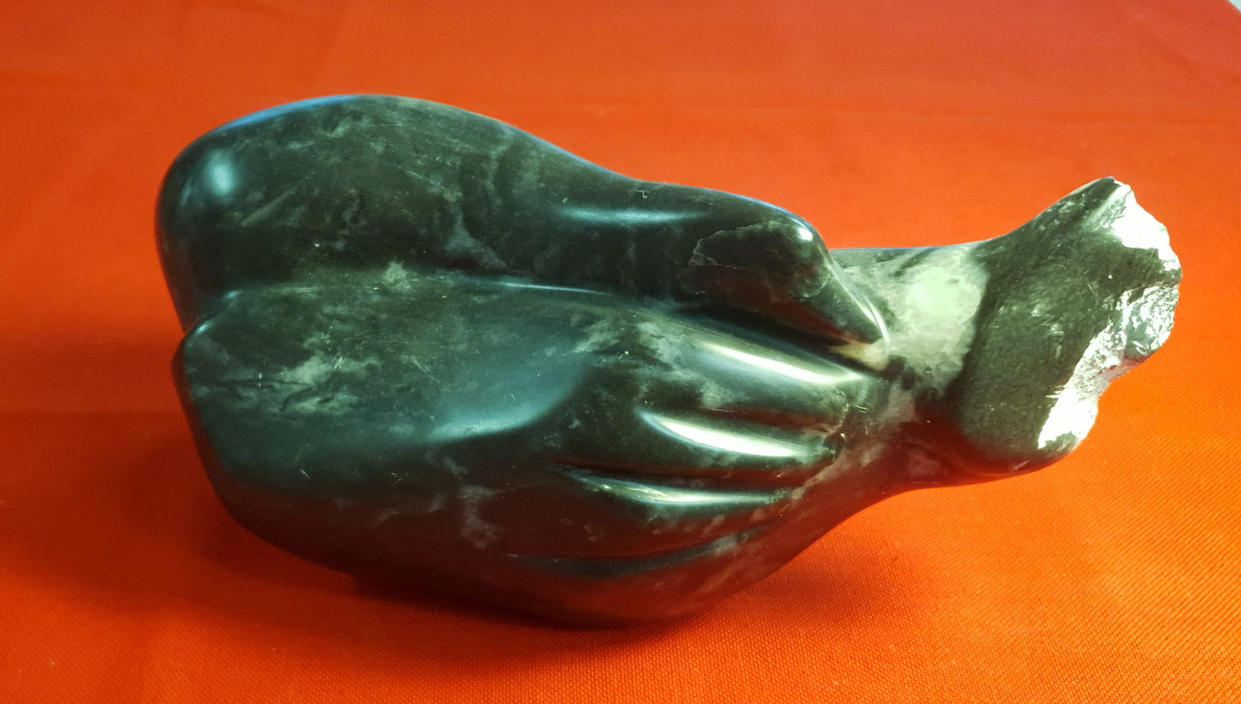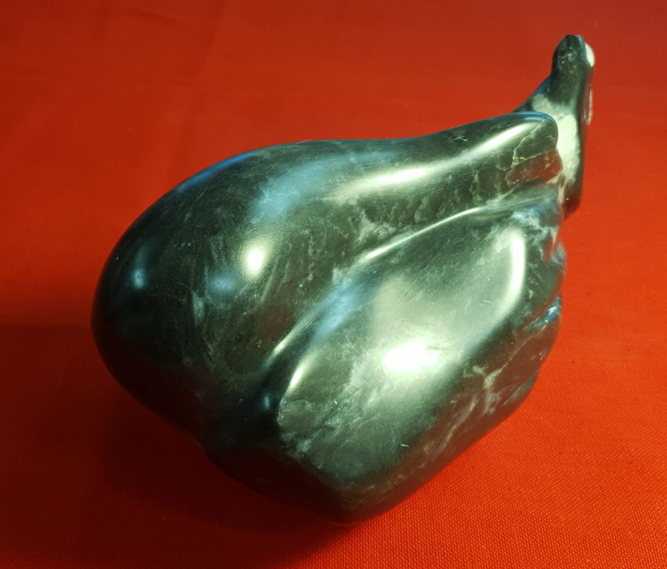 Canard couchant son cou sur l’aile. Stéatite noire à veines blanches. Dimensions: 25/12/12 cm Poids: 3 kg