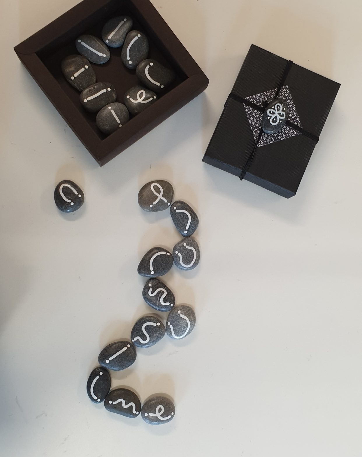Une vingtaine de petits galets peints qui peuvent s’assembler pour former des lignes de courbes diverses.