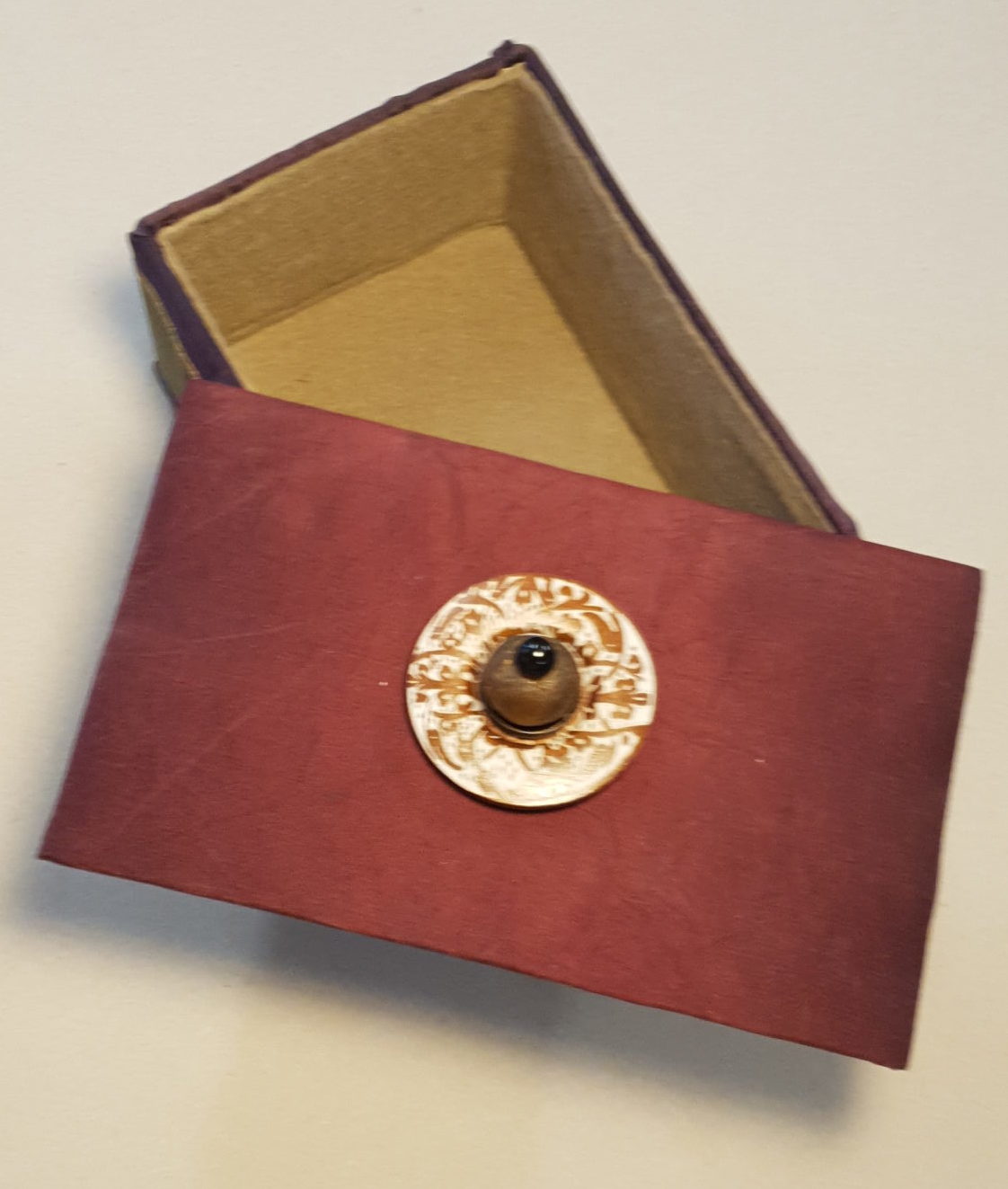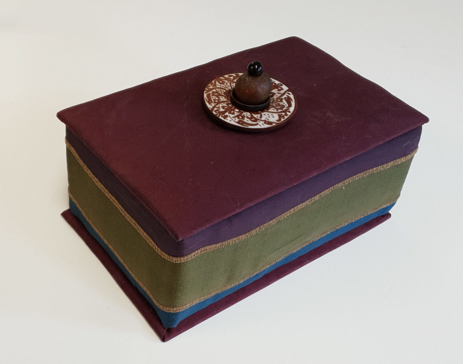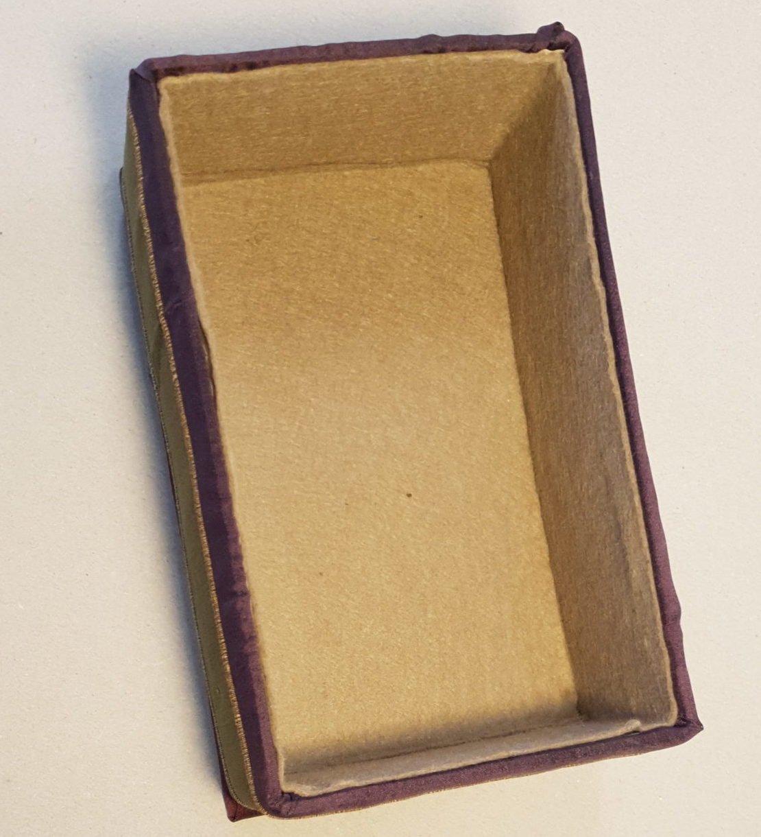 Boîtes avec couvercle. Carton rigide recouvert de soie capitonnée. Coloris bordeau, bleu, vert