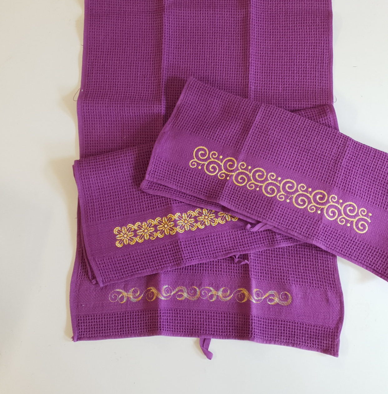 Linges en coton nid d’abeille coloris violet, brodés de différentes frises jaune doré. Lavable à 60°. Dimensions: 50/70 cm. Prix à la pièce: 10.- . Pour 3 pièces: 25.-