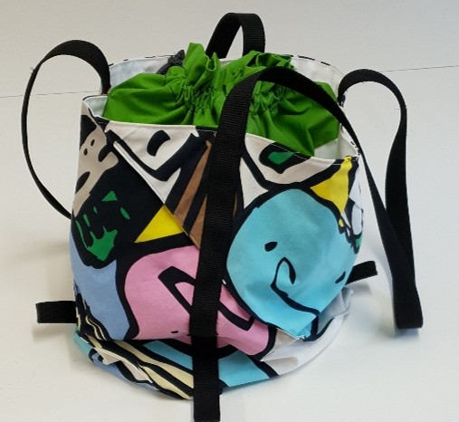 Sac à fond carré en coton épais, coloré. Intérieur en coton vert se fermant par une coulisse. Anses noires