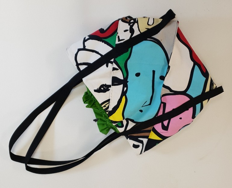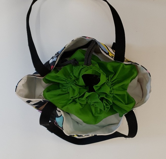 Sac à fond carré en coton épais, coloré. Intérieur en coton vert se fermant par une coulisse. Anses noires Dimensions: 45/32 cm + anses.