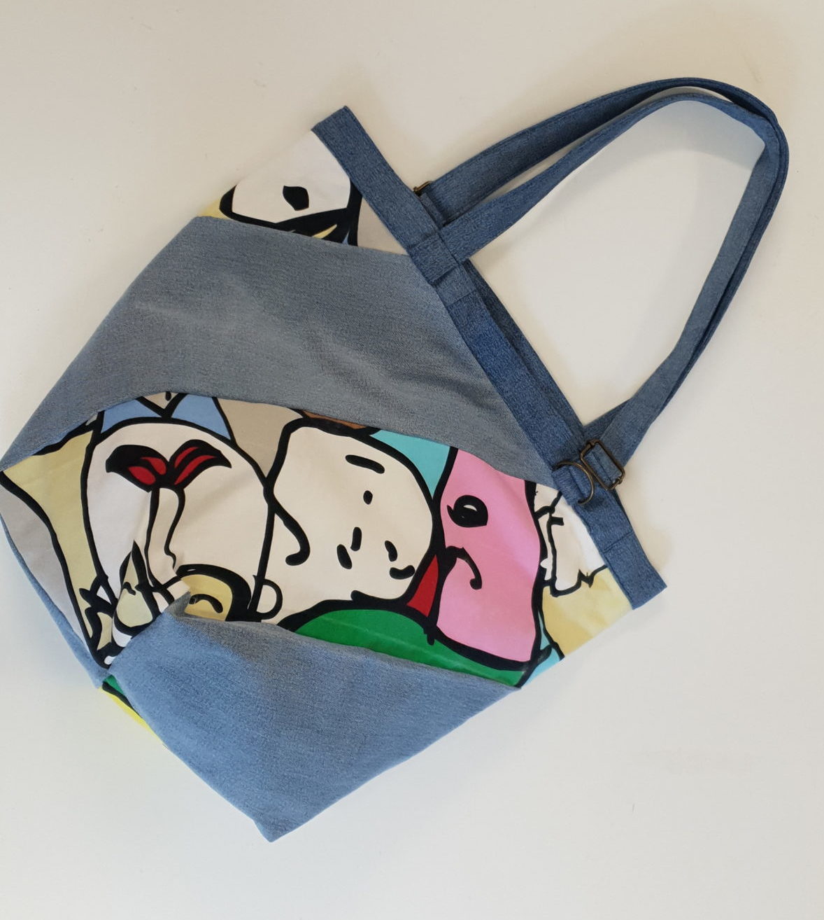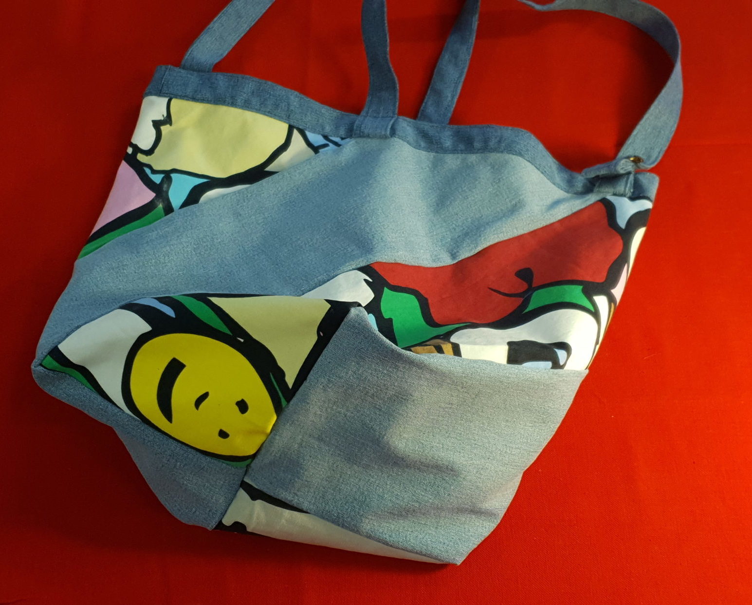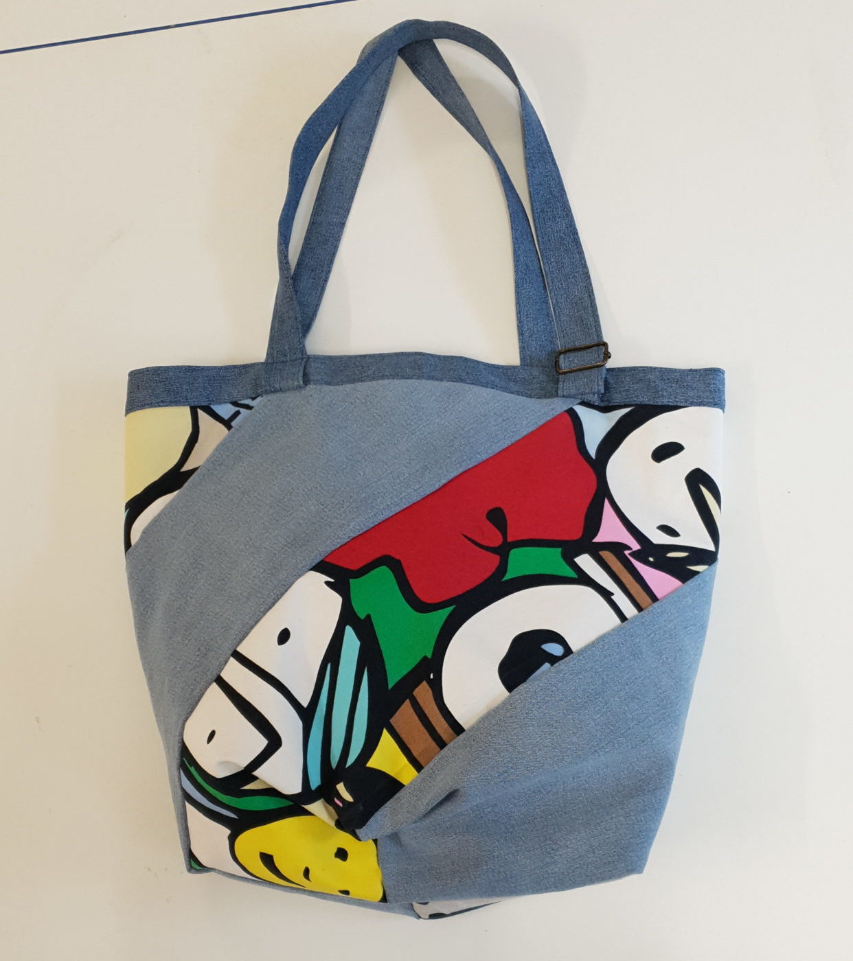 Sac constitué de bandes de tissu de jean’s recyclé et de coton à motifs stylisés dans des tons vifs. Doublure et poche intérieure. Anses réglables. Dimensions: 40/45 cm + anses.