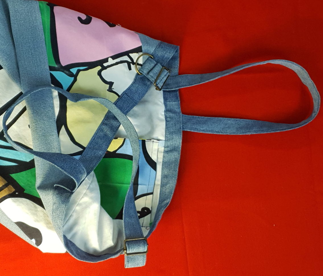 Sac constitué de bandes de tissu de jean’s recyclé et de coton à motifs stylisés dans des tons vifs. Doublure et poche intérieure. Anses réglables.