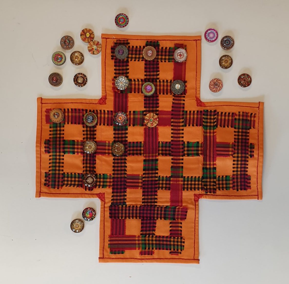 Sachet contenant un plateau de jeu en tissu et 36 pions fabriqués en boutons recyclés.