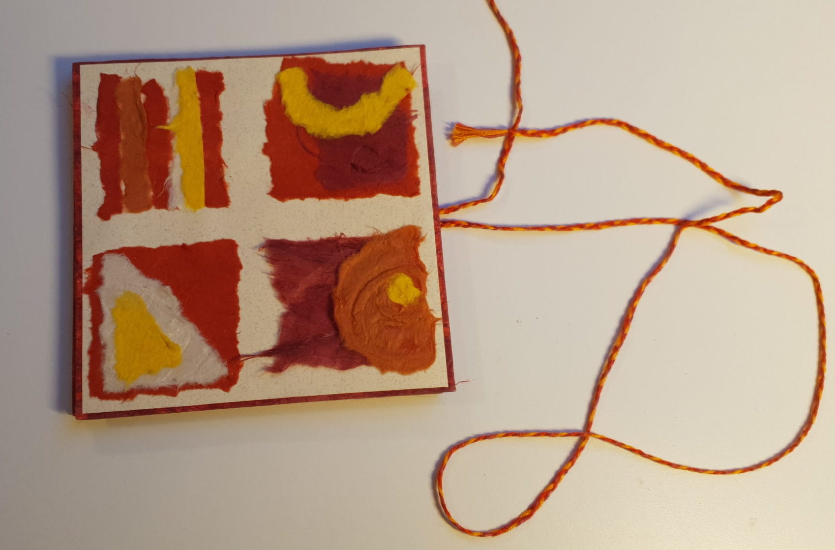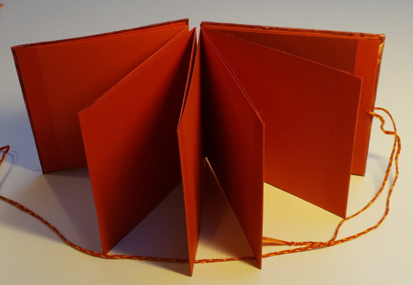 Mini album en accordéon. Couverture décorée de motifs en papiers artisanaux colorés. 10 doubles pages cartonnées, coloris rouge. Fermé par lacet.