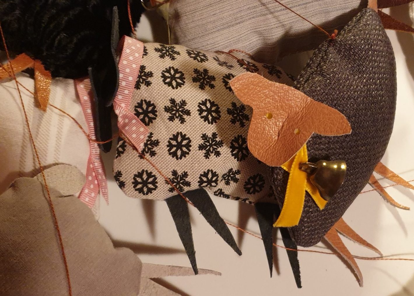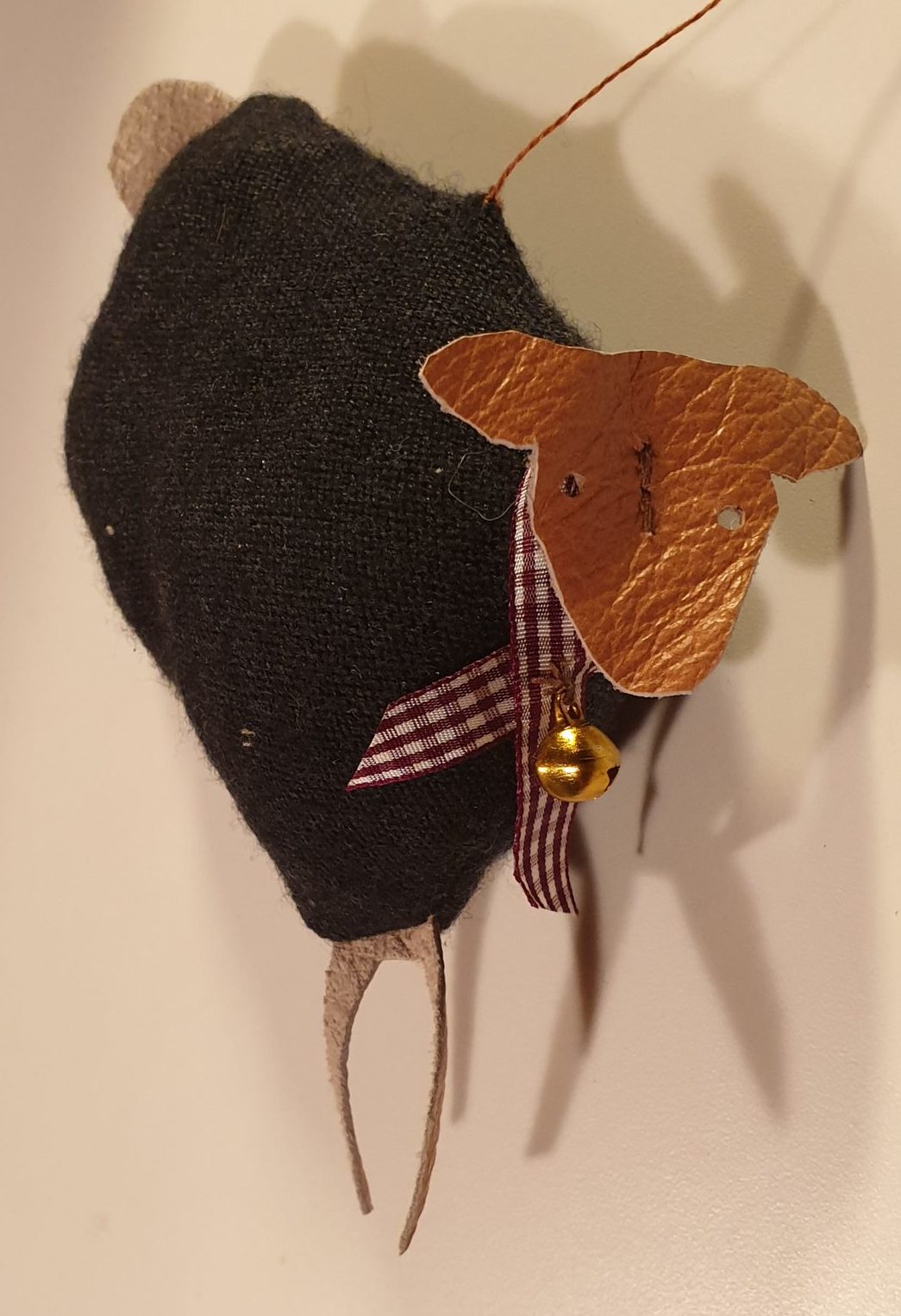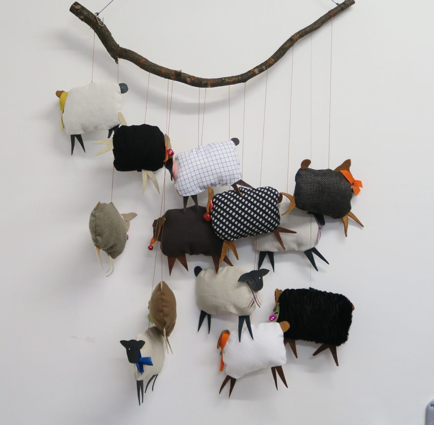 Petit troupeau de moutons suspendu à une branche. Les figurines sont en tissu rembourré, têtes et pattes en cuir, clochettes à l’encolure.