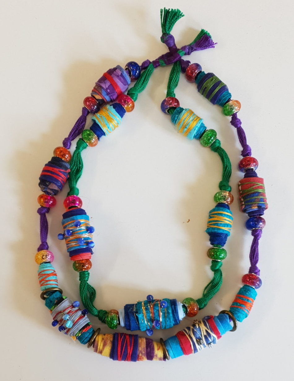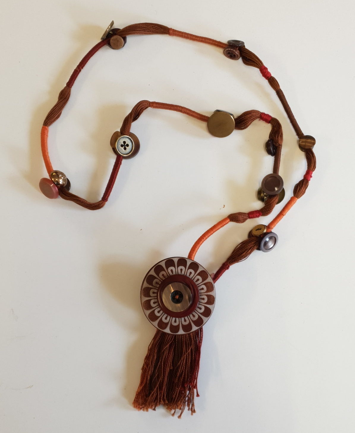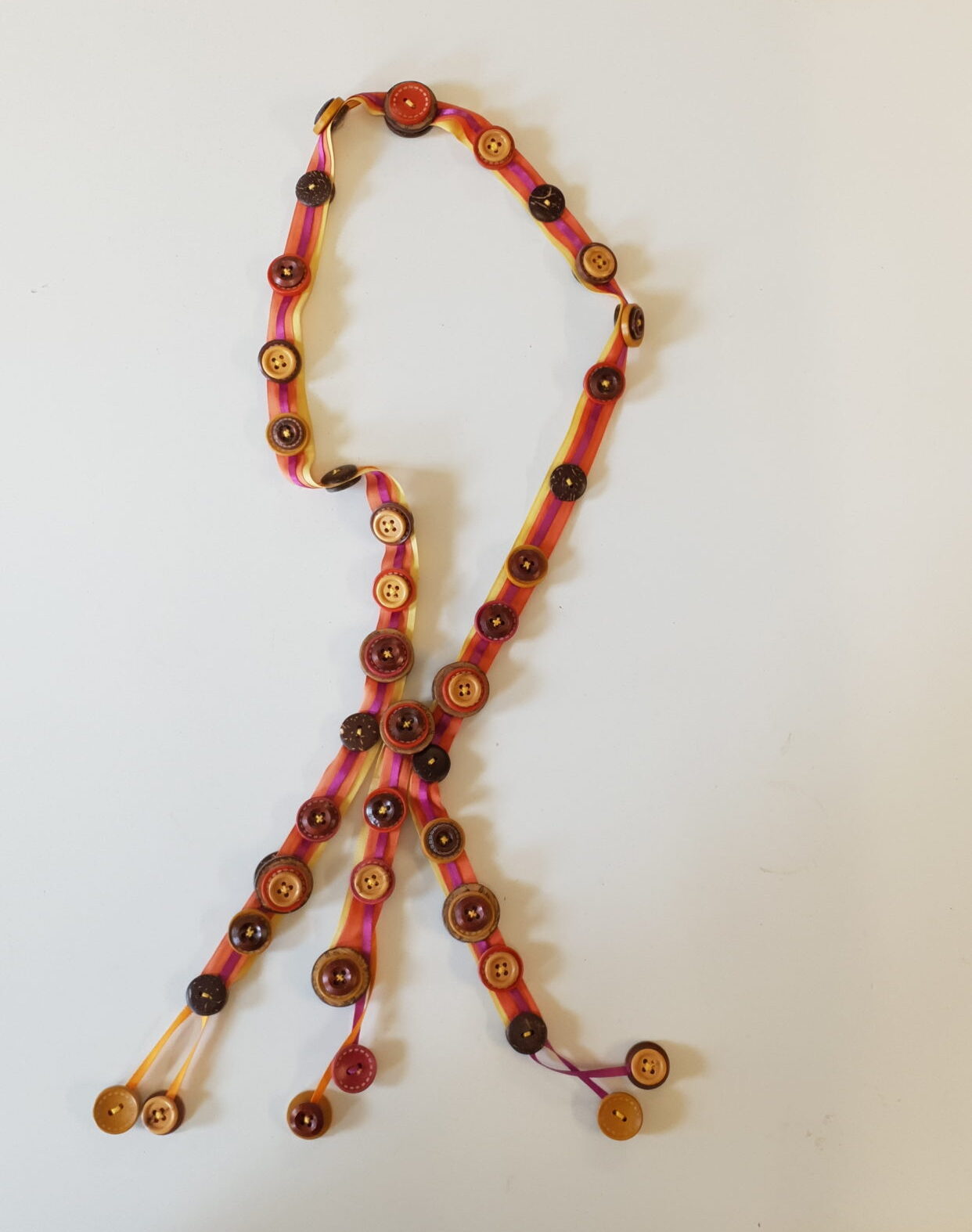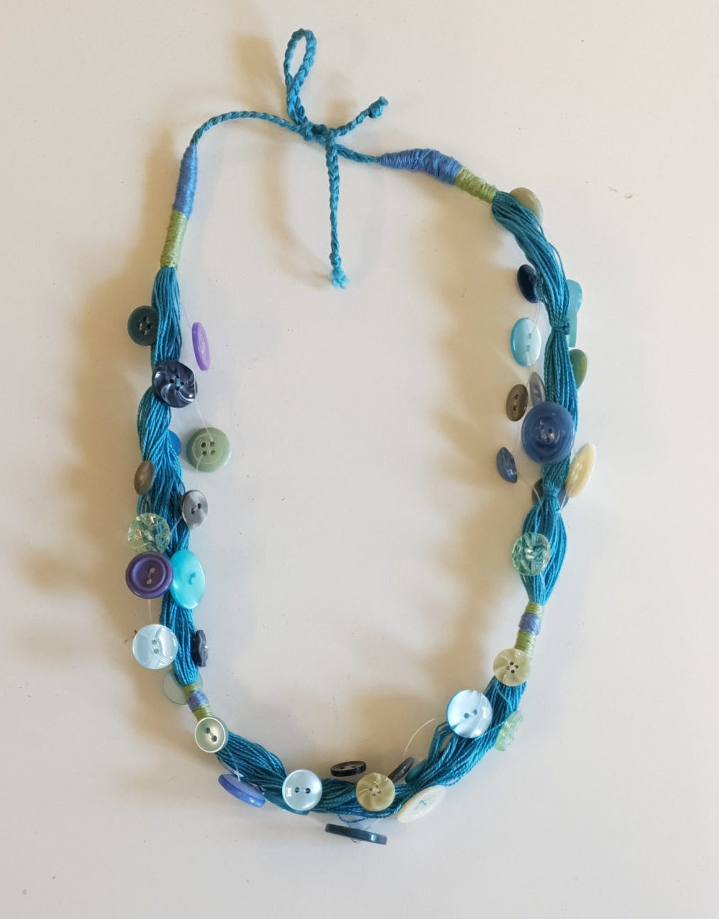 Lacet de coton bleu clair orné de boutons de nacre. Noué sur le cou.