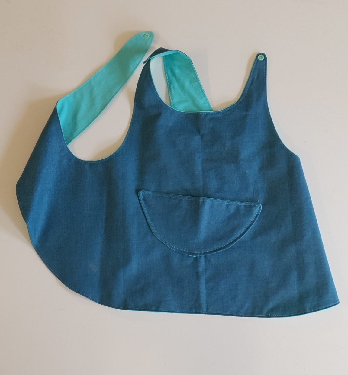 Tablier croisant dans le dos et fermé sur les épaules par une pression. Toile imprégnée doublure en coton. Coloris bleu et turquoise, bleu et vert clair Dimensions: L 32 cm, H 44 cm